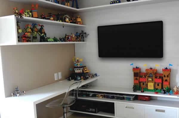 Outra possibilidade deste tipo de mobiliário é planejá-lo de forma com que explore verticalmente o cômodo, proporcionando novos espaços de armazenamento aéreo. Prateleiras e nichos são ótimas soluções para quem tem pouco espaço e muitos objetos para armazenar e, para que combinem com os móveis, nada melhor do que planejar tudo junto.
